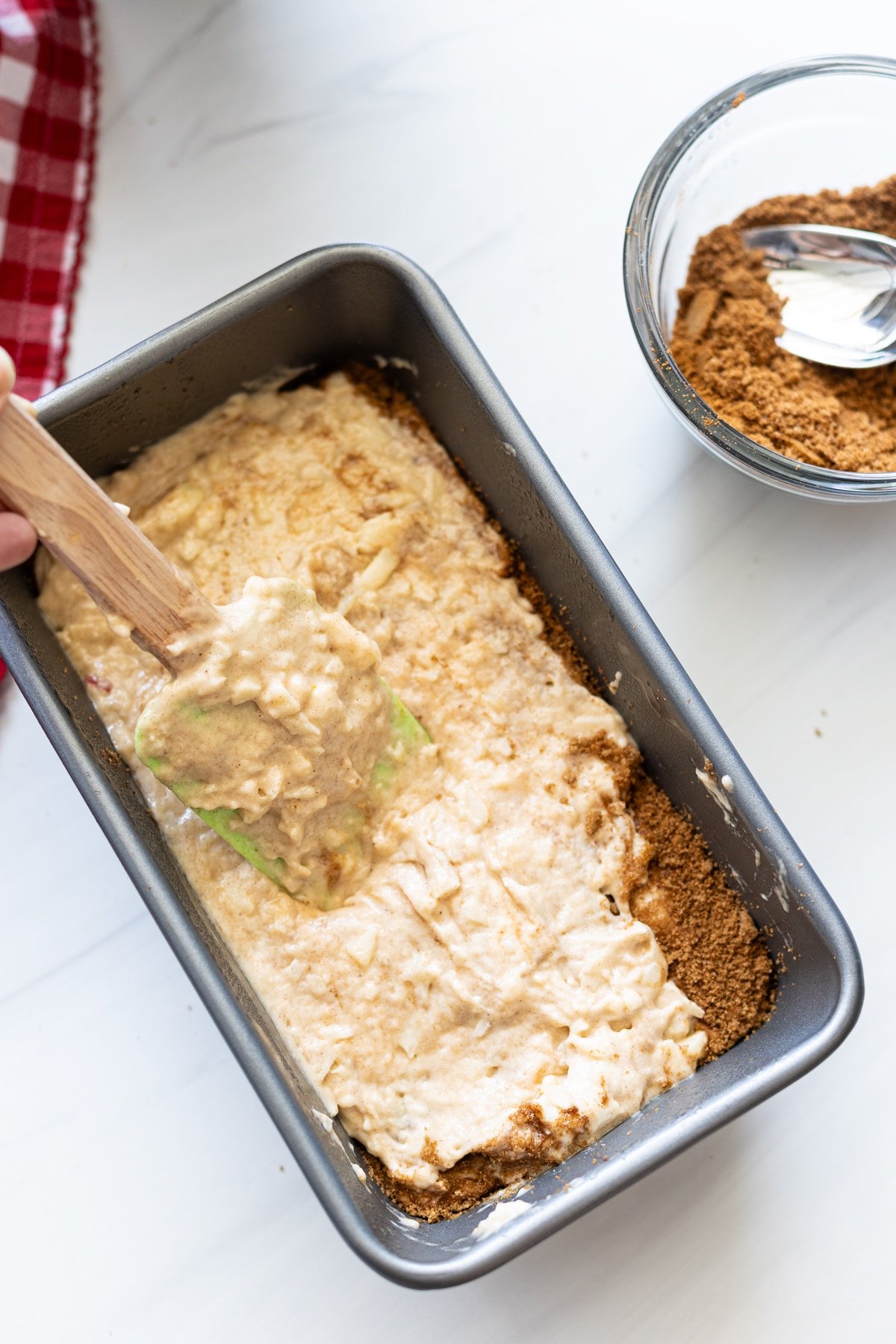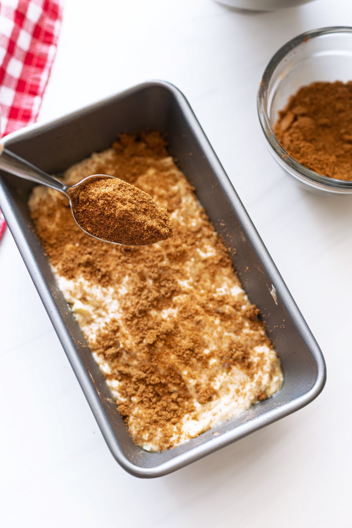 - Add half of the batter to the loaf pan. From there, add a layer of the brown sugar and spice mixture and spread evenly.