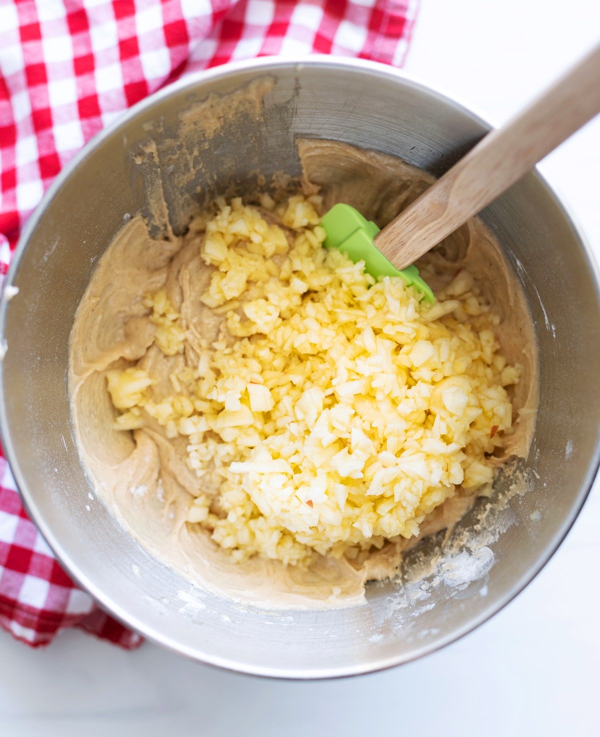 Step 6: Gently fold the chopped apples into the batter. Avoid over mixing. By the way... If you're planning on adding nuts to the batter, this is the step to do it!
