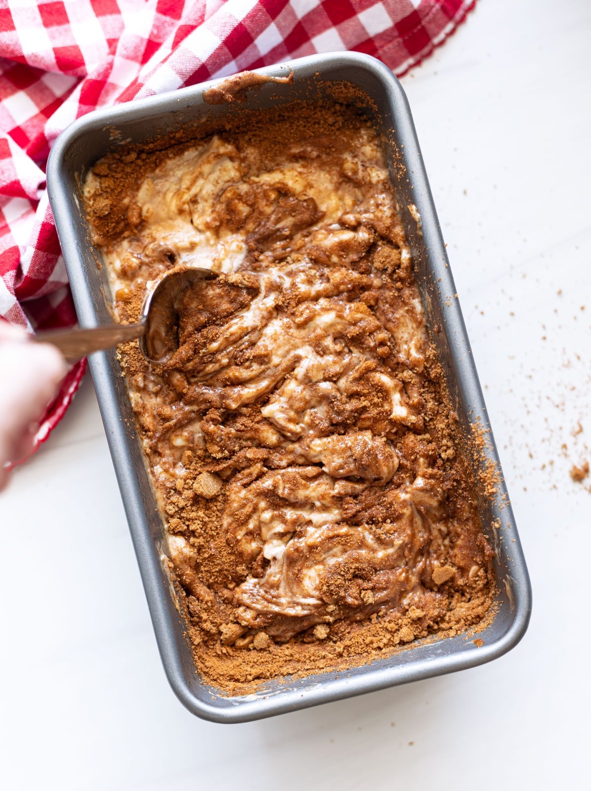 - Using a spoon, level the brown sugar and spice mixture while slightly swirling it into the top layer of the bread batter.