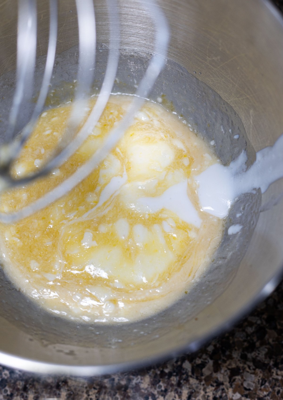 Step 4: Next, add the melted butter, buttermilk, and vanilla extract. Mix on low speed for 1 minute, until well combined.