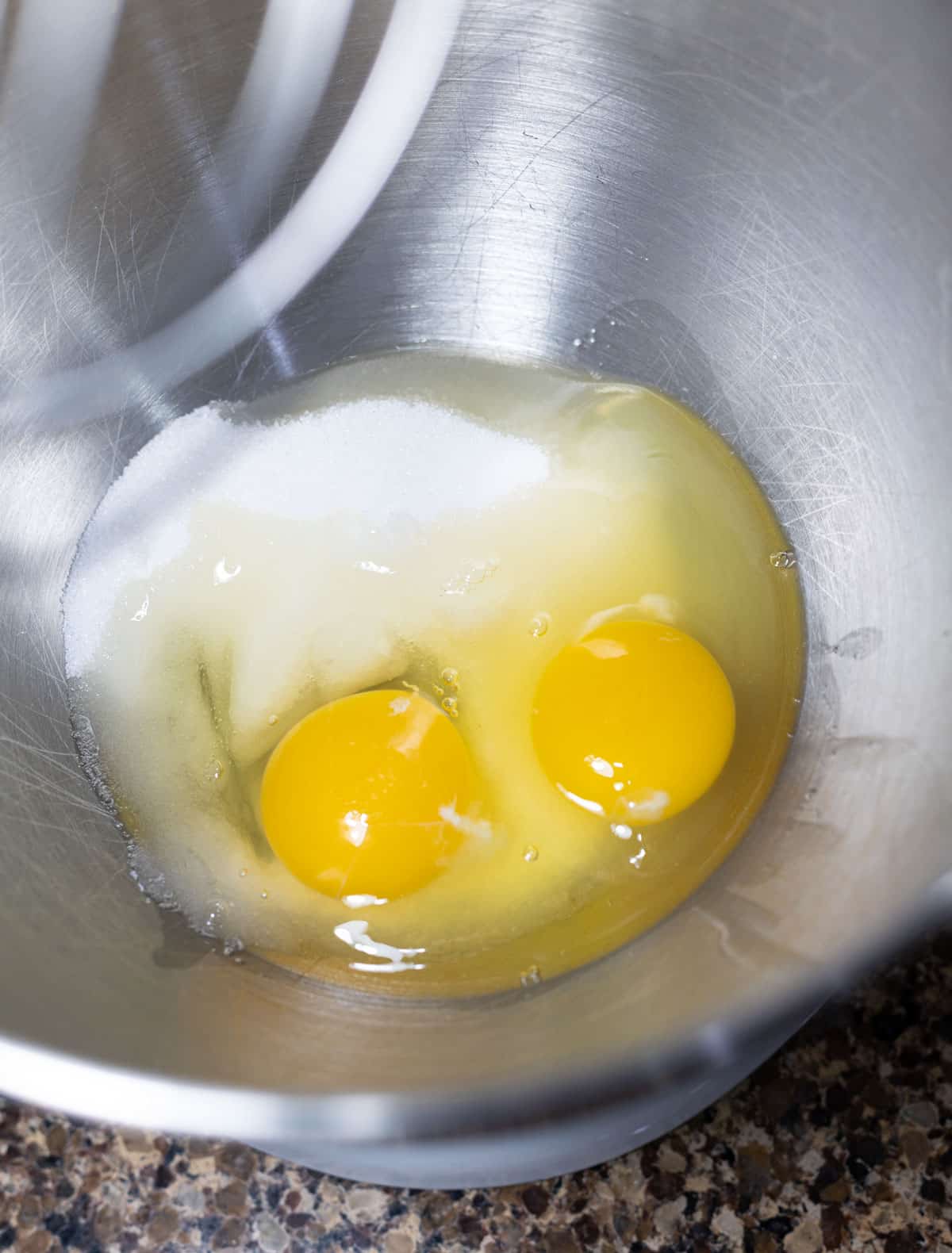 - In a large mixing bowl, add 2 eggs and ½ cup granulated sugar and mix on low speed for 1 minute.